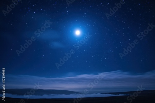 Full moon glowing brightly in a clear starry night sky above a serene landscape