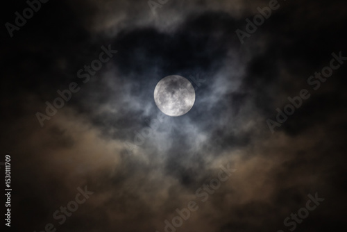 Full moon in the dark night sky with clouds