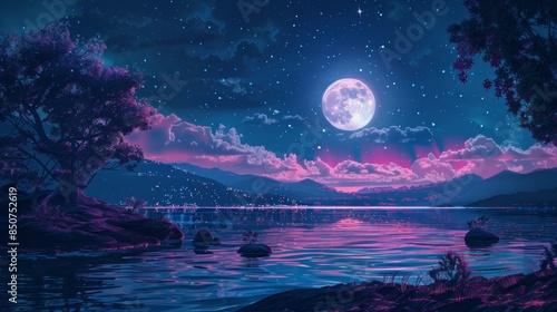 Full moon night painting in the style of photo-realistic landscapes depicts the moon atop the lake at night.