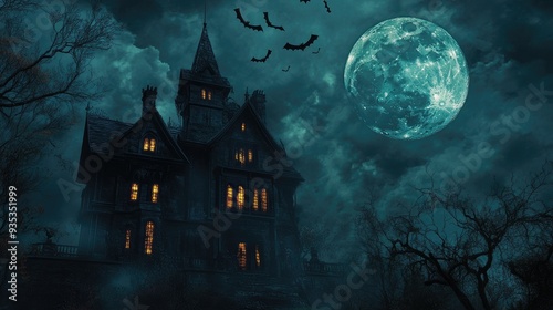 Full moon night with bats flying above a haunted house, glowing windows casting an eerie light, and plenty of space for text