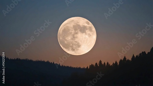 Full Moon Serenity: Majestic full moon rising over a dark silhouette of a pine forest at night. The tranquil scene evokes a sense of peace and wonder.