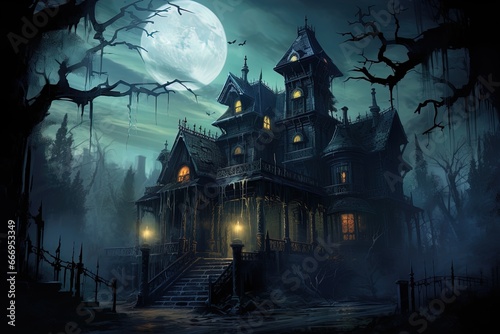 Full moon shines over a creepy haunted house. Great for stories of horror, Halloween, October, spooky, witchcraft and more.