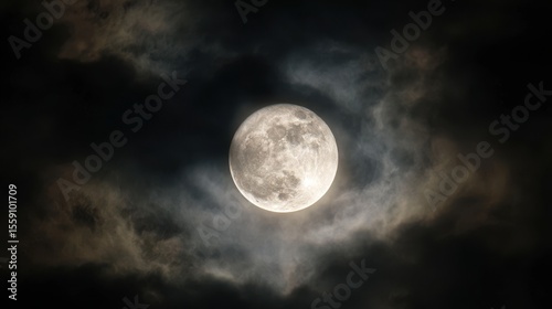 Full Moon Shining Brightly Through Ethereal Clouds on a Dark Night Sky
