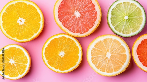 Full screen close-up of oranges, grapefruits and limes cut into slices. Juicy refreshing citrus fruits. Fruit background. Illustration for banner, poster, cover, brochure, advertising, marketing, etc.