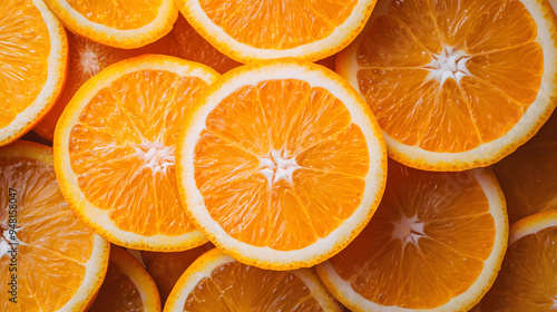 Full screen top view of sliced oranges with vibrant color and juicy pulp