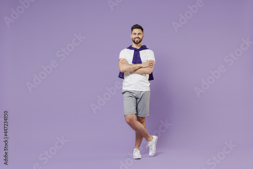 Full size body length happy young brunet man 20s wear white t-shirt purple shirt hold hands crossed look camera isolated on pastel violet background studio portrait. People emotions lifestyle concept.