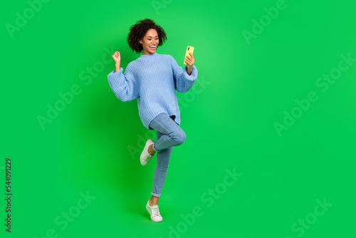 Full size photo of hooray curly lady look telephone wear sweater jeans shoes isolated on green color background