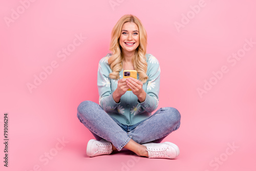 Full size photo of lovely young woman floor crossed legs hold device dressed stylish flower print garment isolated on pink color background
