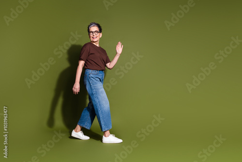 Full size photo of nice aged woman walk arm wave hi wear t-shirt isolated on khaki color background