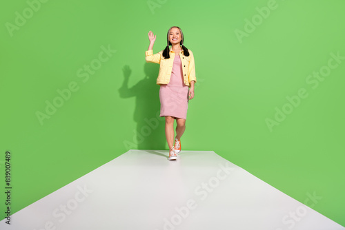 Full size photo of nice young girl wear jacket dress walk podium arm wave hi isolated on green color background