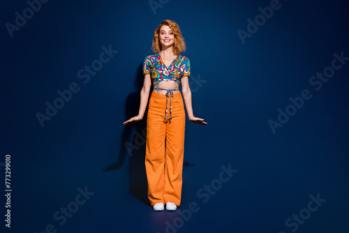 Full size photo of pretty young woman empty space ad wear top isolated on dark blue color background
