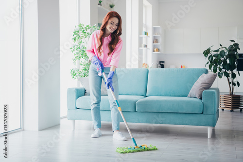 Full size photo of pretty young woman mopping floor living room modern bright interior apartment indoors
