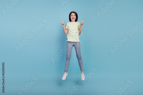 Full size photo of young excited girl good mood show peace cool v-sign isolated on turquoise color background