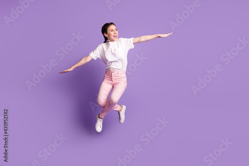 Full size photo of young girl happy positive smile jump up hands wings fly isolated over violet color background
