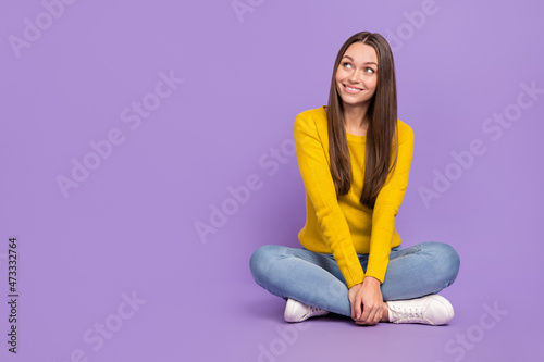 Full size photo of young girl wonder look empty space think plan minded sit floor isolated over violet color background