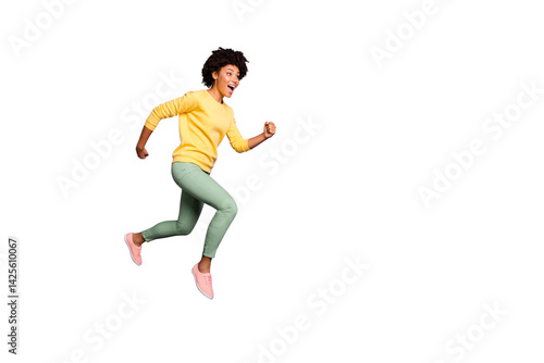 Full size profile side photo of crazy funky afro american girl jump hurry after spring discounts move fast feel carefree expression wear casual style outfit isolated violet purple color background