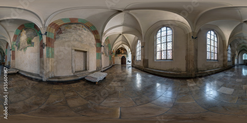 Full spherical seamless hdri panorama 360 degrees in corridor of hall with arches and columns in the monastery in equirectangular projection, VR content
