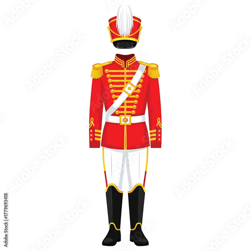 Full view of a traditional red and gold military uniform with white sash and black boots, isolated on white background