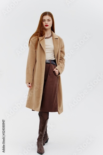 Full-height shooting. A red-haired girl dressed in brown clothes in a coat and boots poses on a white background in the studio