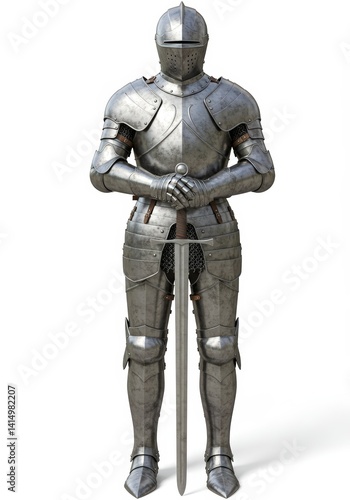 Full-length knight's armor with sword in hand isolated on a white background