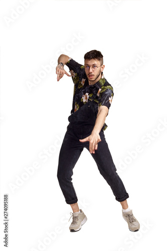 Full-length portrait of a funny guy dancing in studio isolated on white background.