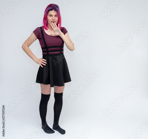 Full-length portrait of young pretty teenager girl in burgundy T-shirt and black dress with beautiful purple hair on a white background in the studio. Talking, smiling, showing hands with emotions.