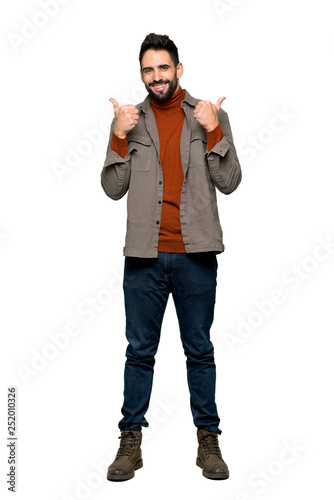 Full-length shot of Handsome man with beard giving a thumbs up gesture with both hands and smiling on isolated white background