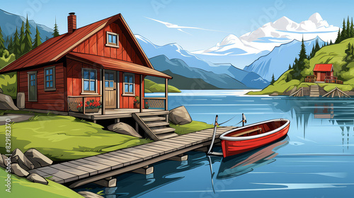 Fun and colorful chibi style lake scene with vibrant colors and whimsical retro cartoon aesthetic.