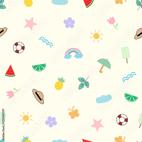 Fun and colorful seamless repeat vector pattern featuring summer weather elements. Cute summer holiday design vibrant cartoon icons in a doodle for wallpaper, fabric, textiles and wrapping paper.