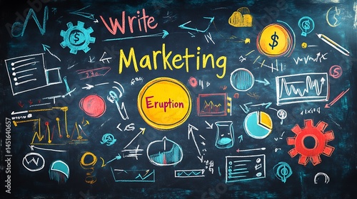 Fun chalkboard schematic with center-aligned “Write Marketing” in multicolor chalk, yellow chalk circle highlighting key business components, green gear next to “Eruption”,