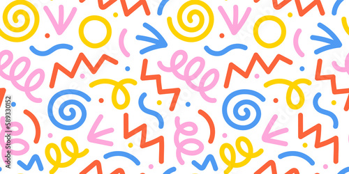 Fun colorful line doodle seamless pattern. Creative minimalist style art background for children or trendy design with basic shapes. Simple childish scribble backdrop.