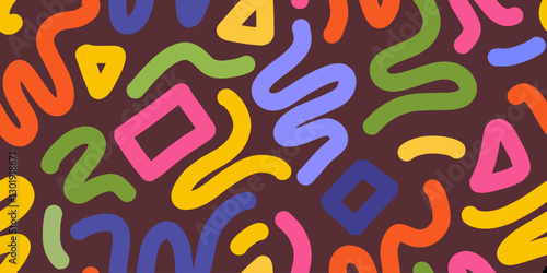 Fun colorful line doodle seamless pattern for kids birthday party or celebration background, trendy design with scribble shapes on black backdrop