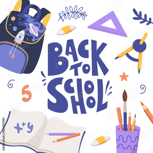 Fun doodle school postcard with books, pencils, backpack and back to school lettering. Perfect for invitations, posters, kids stationery, and prints. Hand drawn vector flat illustration.