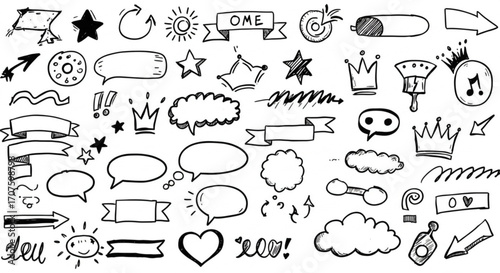 Fun doodle sketch elements, speech bubbles, crowns, arrows, stars for creative projects and designs