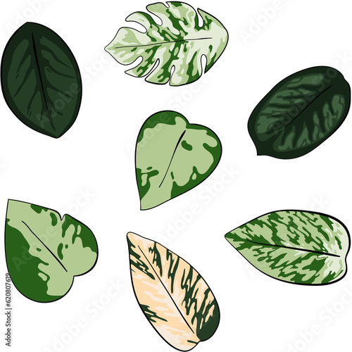Fun green leaves as a collection of different shapes. These foliage drawings can be used for event invatations, boho decorations, artwork textures and much more. Colorful leaf illustrations for summer