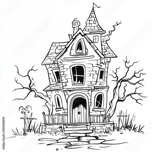 Fun Halloween coloring page featuring a cartoon haunted house for kids