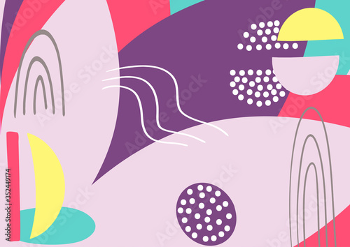 Fun hand drawn colorful shapes, doodle objects and lines, dots collage, modern trendy abstract pattern background for design. Pink yellow blue purple pastel colors