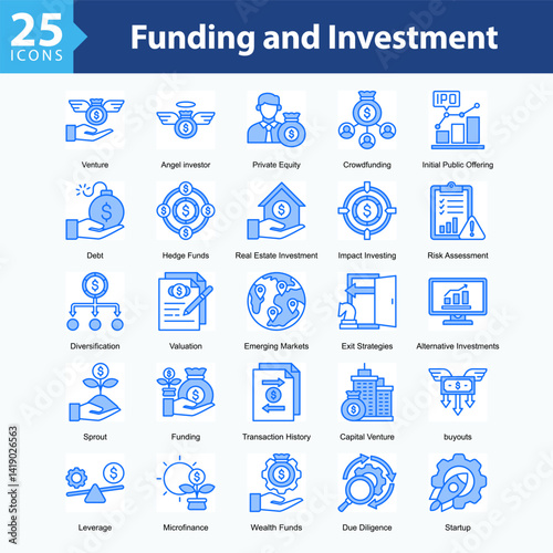 Funding and Investment is a collection of icons in sheet format illustrating modern investment strategies, financial growth, and sustainable economic approaches.