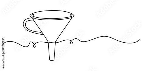 funnel with handle continuous one line drawing, Continuous line art of an oil funnel, Funnel Black Stroke Linear Icon, Filter funnel one line continuous drawing. Laboratory glass equipment continuous.