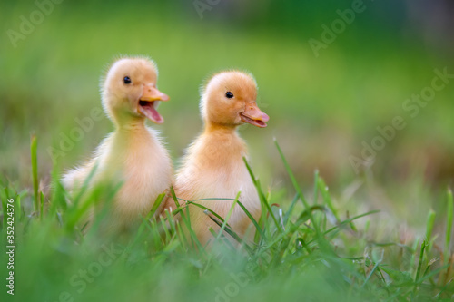 Funny Little yellow duckling on spring green grass