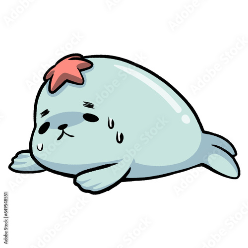 Funny animal illustration. Baby seals are tired from the sun. and a red starfish on its head