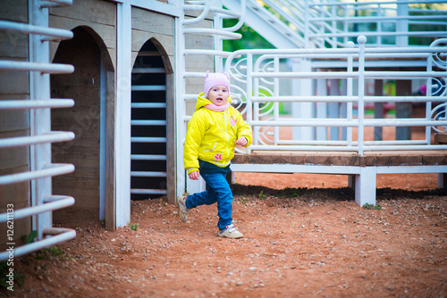 Funny baby girl in a yellow coat and pink hat