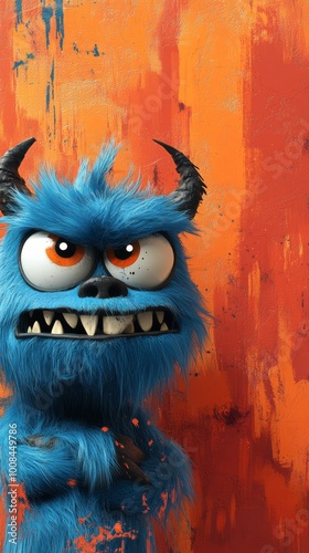 Funny blue furry monster character. Monster, cartoon, characters, halloween poster, flyer, advertising. Room for copy space.