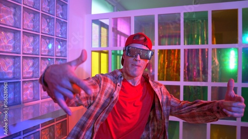 Funny break dancer moving freestyle step to hip hop while looking at camera. Crazy happy hipster dancing and performing street dancing while wear casual outfit and sunglasses in Led light. Regalement.