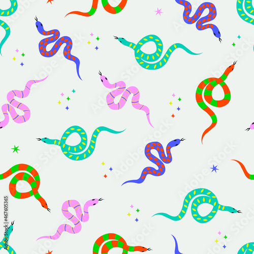 Funny cartoon snakes seamless pattern. Cute snake with colorful scales. Hand drawn trendy vector illustrations. Retro design for fabric, packaging, cover, website.
