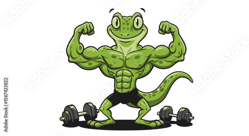 Funny cartoon vector of a gecko bodybuilder flexing muscles at gym with confident pose