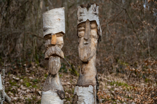 Funny carved faces in sawn-off birch trees