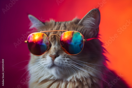 Funny cat wearing sunglasses in studio with a colorful and bright background. Generative AI