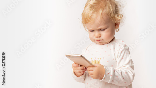 funny Caucasian little girl feeling angry as she lost game. Mad female child having displeased look because of low battery on cell phone or bad cellular connection