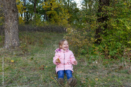 Funny child eating pie in the forest